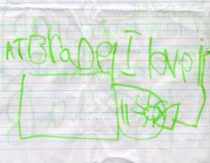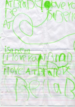 This is the backside of her letter saying she loves me and loves being at our boat. Don’t you love how she spells “at Brade” meaning “aunt Brandi”. Then she writes “I love you at Bran” . . . the “bran” cracks me up because I’ve always despised being called Bran for short. Sounds like a box of cereal or something. What a sweet thought to give a gift to her auntie that usually only mom’s experience. From the soul of my heart, Thank you Miss Bella you make me smile! You’re so sweet I could put you in my coffee.