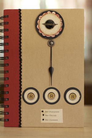 My first challenge was to make a journal where I jot down miscellaneous notes or brilliant thoughts I may have. HA! Imagine that 🙂 Vintage items on this journal are the clock hand and the round cream colored poker chip under the doo dad that says “create”.
