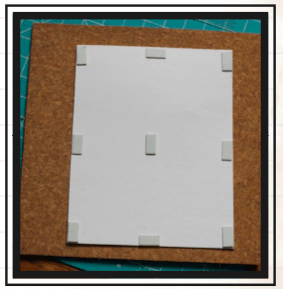 Trim corkboard to fit onto matboard and use adhesive foam tape (usually included with the cork tiles) to adhere the cork to the matboard. At this point, lay the cork/matboard piece in the opening of the frame and make sure there is still room for the fabric. Trim a little bit off of each side if necessary.