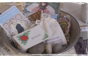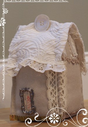 Here’s mine . . . not nearly as fully decorated as Charlotte’s.  But these cottages are a work in progress.  You add to them here and there to your heart’s content.  I’m loving my choice in chimney construction, for sure buttons are a girls best friend especially in the cream color family!!!  Gosh I’m thinking I play it too safe with my choice in colors or lack there of!  I should let loose and craft something in a wild saucy color pallet.  Yeah I need a little sauciness added to my play it safe personality.