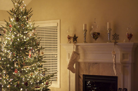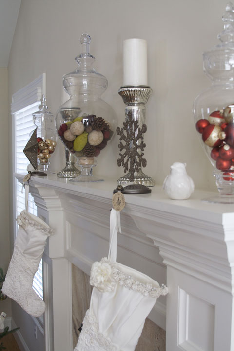 The stockings are very near and dear to me. They are handmade from my wedding dress. One of my most cherished Christmas decorations.