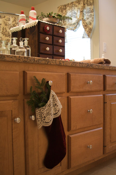 The guest bath. This stocking holds memories for me as well. This one comes from my teenage years and was handmade by someone who was connected to a near and dear friend of mine.