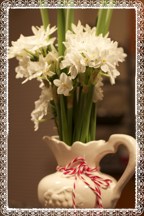 While I love all seasons including Winter – Winter lacks in the area of green/flowery life.  Well, this year I decided why not grow some of those gorgeous paper whites and have a pot of them in the house all winter.  I just knew for sure that this would satisfy my need of green growth which it did however . . . how is it that this gorgeous flower yields such a foul scent?