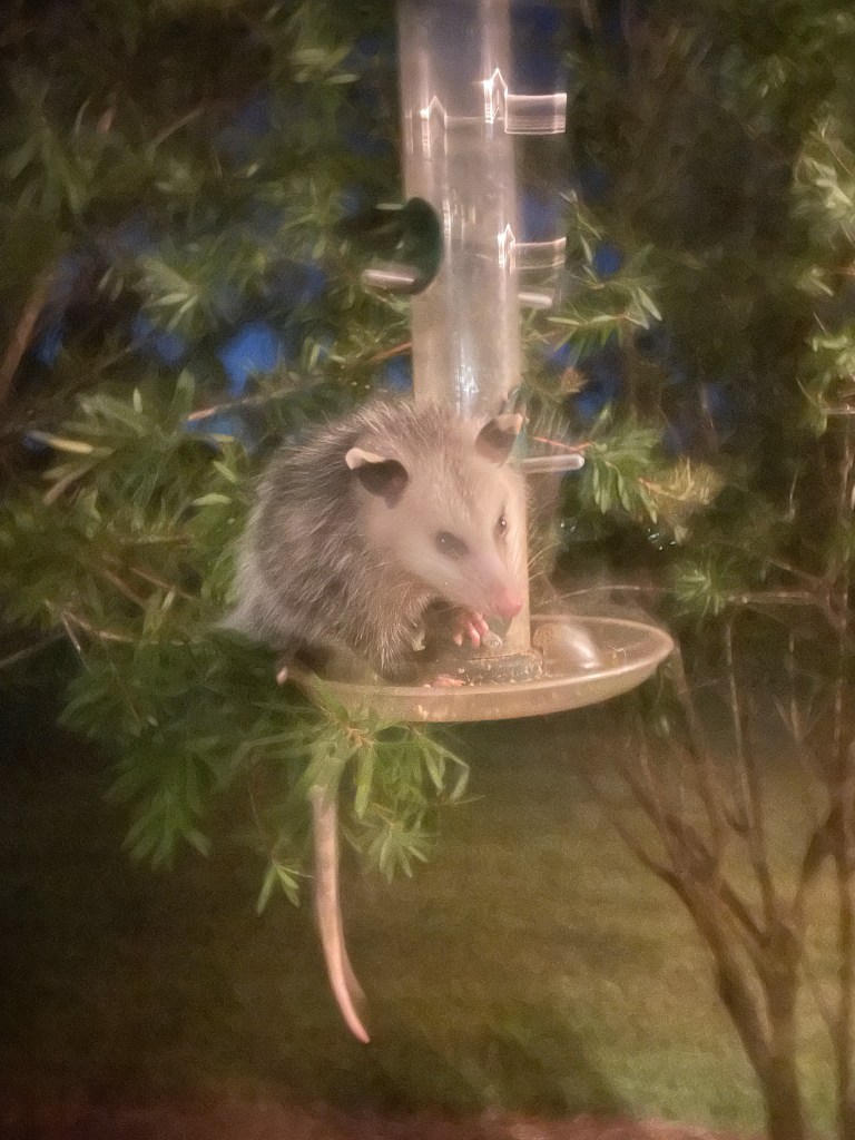 For the longest time Brandi thought it was the squirrel getting into our bird feeder just outside our lanai. Turns out it is our possum we appropriately named Gimpy, he visits every night with a severe gimp with his rear leg.