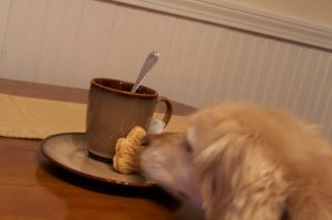 What the???  You with the blond fur . . . get the . . . move your slimy nose away from . . . Hey you furry thing get away from my maple cookie boy!  A bit of subject blur there as I didn’t expect to be taking a picture of a “moving” subject.  I swear this little devil can smell food from anywhere in this house.