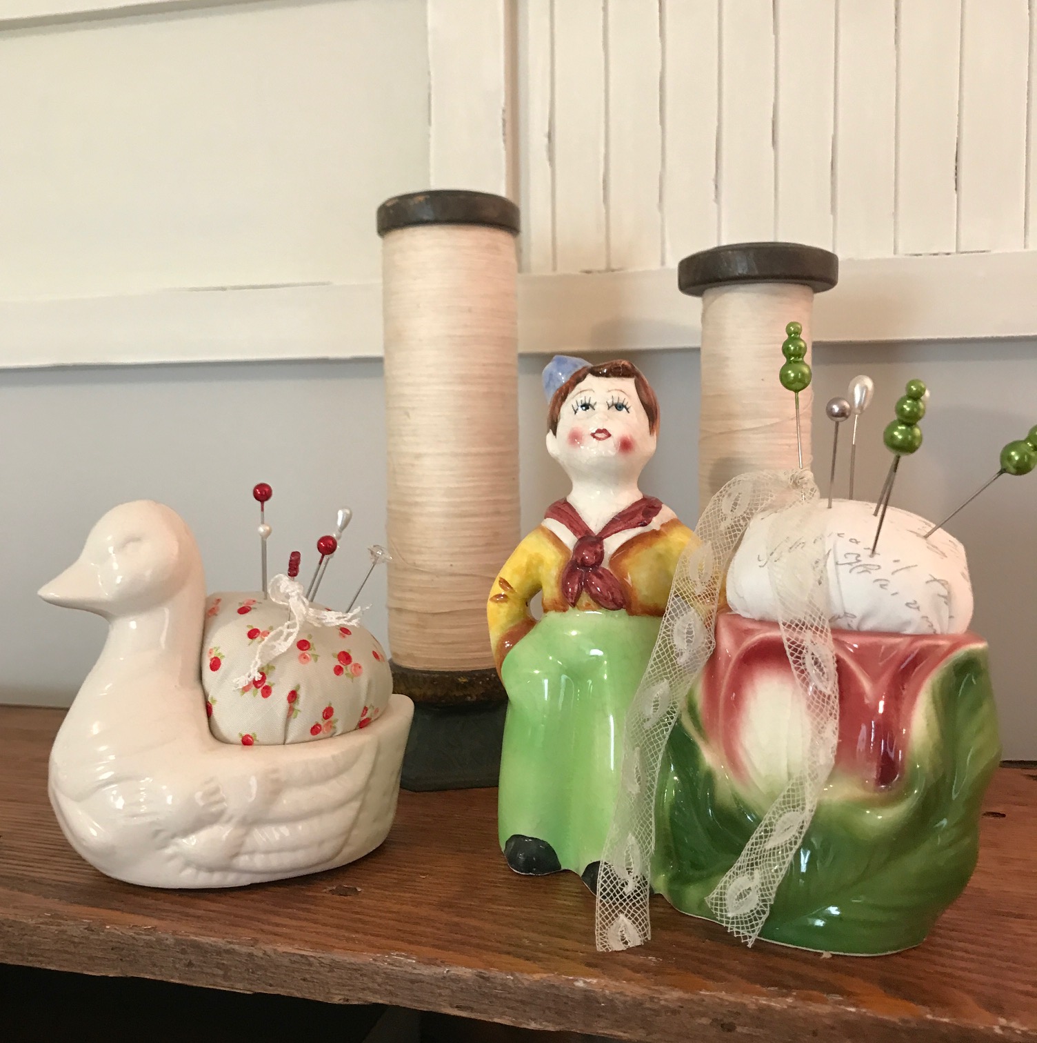 Vintage planters turned into cute pin cushions.  These cuties came from my father-in-laws estate. Not sure why he had them and if he ever used them for anything, but when my husband saw them, he knew I’d surely make them into something for my sewing room/studio.  Inspired by Lori Holt, check out her tutorial on how to make pin cushions from vintage finds. 🥰